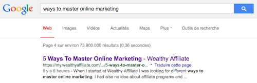 And what about searching "ways to master online marketing" without the quotes? Doing so will put me in the whole competition. Right? (Here are the drums)... Not on the first page, I clicked next, Not on second page, I clicked next, Not on third page, I clicked next! Results are awesome. I'm first on page 4 (see snapshot below). This means that in less that a few hours I climbed to the 31st rank.