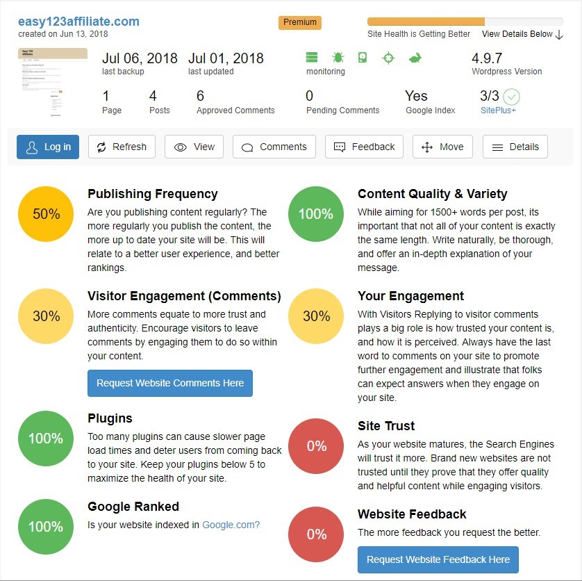 You can see below the Site Health of my site located in SiteManager, slowly but surely I am moving forward and pleased with what I am seeing. Some may think this is not a big deal but it is a great improvement from the start.