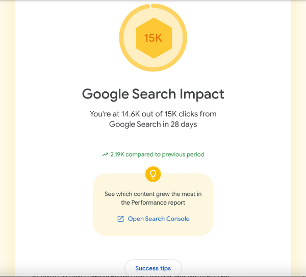 You can see that, so far (it's still in progress), my clicks have increased by 2,190 since the last 28-day achievement period. This page also allows you to see what content grew the most by clicking on "Open Search Console," and there is a generic reference page you can go to for "success tips."