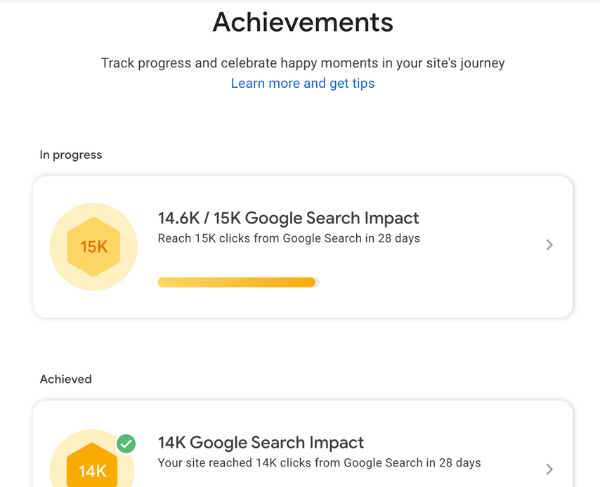 Your "in progress" achievement is on top, followed by the completed GSC click achievements for each 28-day interval. Clicking on the "in progress" achievement will give you its "Google Search Impact Data."