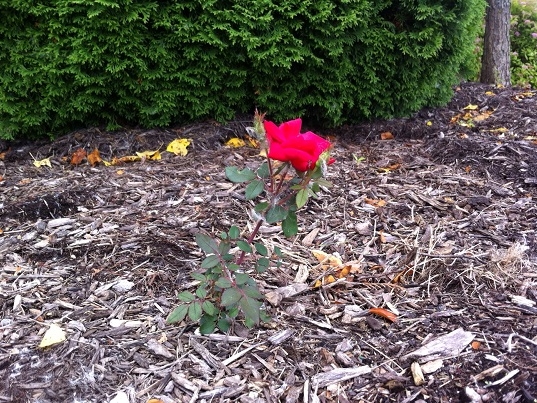 Earlier this week, looking out the window, I saw something red on my flower bed and upon taking a closer look; it was a lone rose bud sticking out from the spot where one of the bushes used to be. It survived.