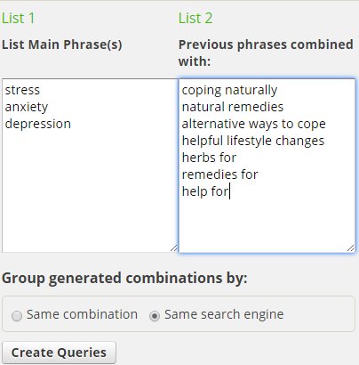 Ninja Search Combination Tool: Once you put in your keyword/search word or term, this tool gives back a huge list of queries, each of which is linked to a google search PLUS it lets you combine your main words or phrases with a secondary list of words/phrases! Here's an EXAMPLE for my chosen niche:
