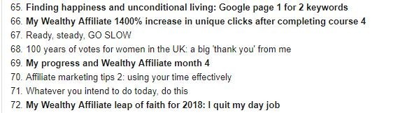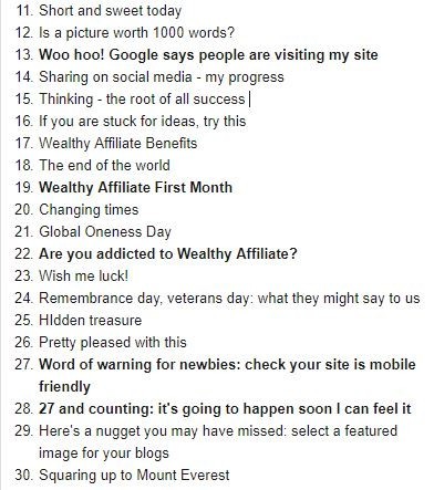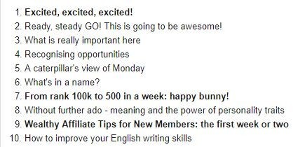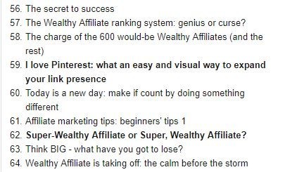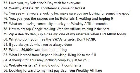 The bold ones are highlighted because they really chart my progress here at Wealthy Affiliate in terms of affiliate marketing success.