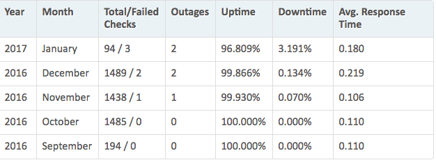 But, I do have one problem. Hosting uptime hasn’t been the greatest in 2017, so far. My uptime stats are 96.809. This isn’t the 99.9% I have had with InMotion Hosting my previous host.