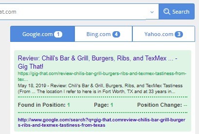 Just a few days ago, I found myself on page 1 position 5 for my Chili's review. Today I am in position 1 with this article