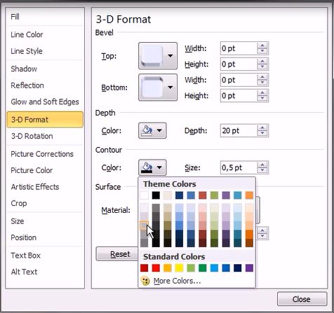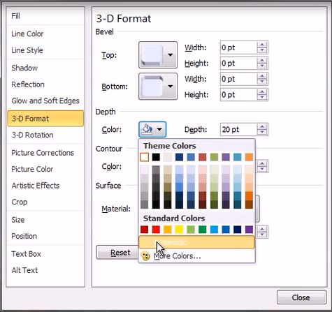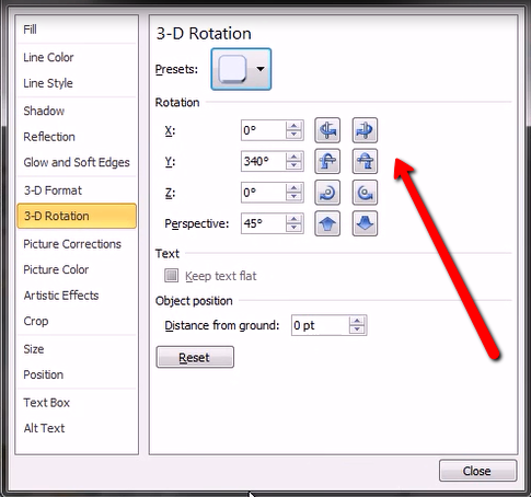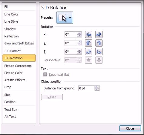 Now click on 3-D Rotation then Presets as shown in the image below: