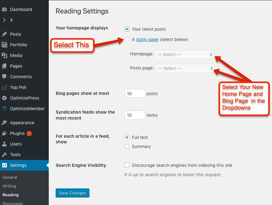 Now that we have our home page and blog pages designed we will now need to go into our WordPress Admin and under settings->reading.