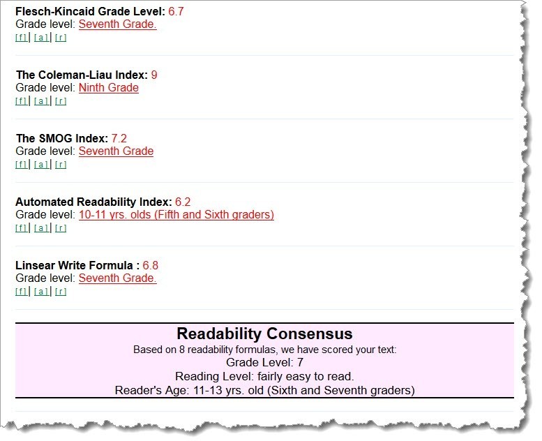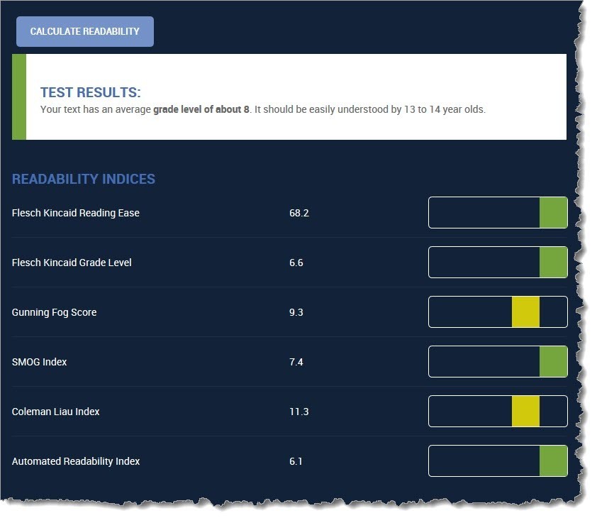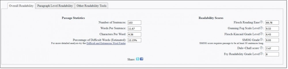 Based on Mike's recommendation below, I have added the Flesch tool as well.Testing sample text returned the following score,