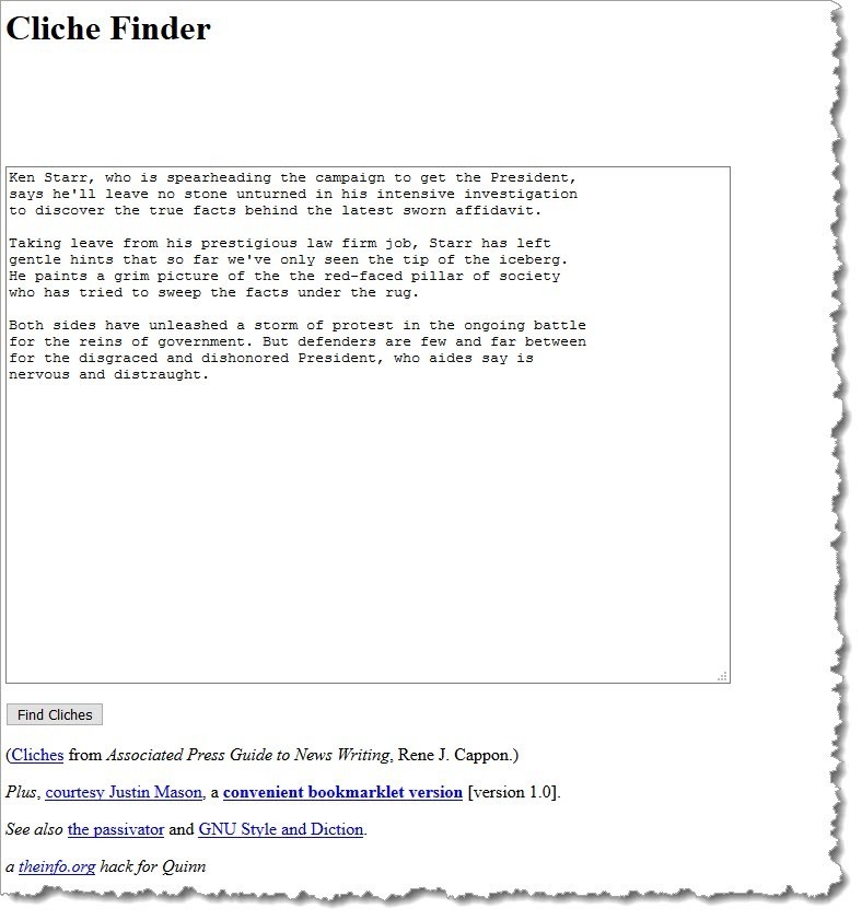 Another handy tool is the Cliche Finder. While it is not a readability tool, it does check for cliches that lessen the impact of your content. Cliches reflect lazy thinking, lazy writing.