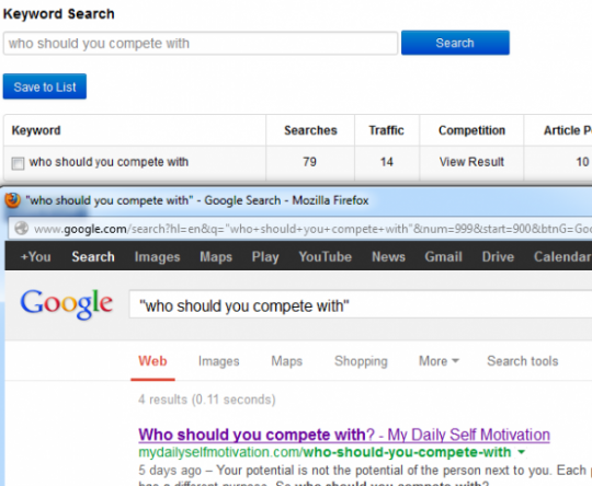 I can fully understand this because the competition on the 'release your potential' keyword is over 1 000 000. So I tried something else - I search for the same keyword but put a very common (to my niche/website) word after it. So now the search reads 'release your potential motivation' and the result... Google #1! Impressive, I thought! The same goes for searching 'motivation to release your potential' - Google #1. So in some ways I can see how easy it is to get my blogs ranked but check this out now: