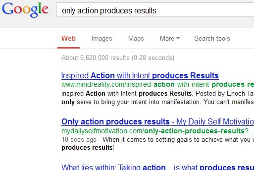 The idea for the blog was about action producing results. The keyword that I thought of was 'Only action Produces Results". Here is another screenshot of the keyword research that I did on the WA Keyword Tool: