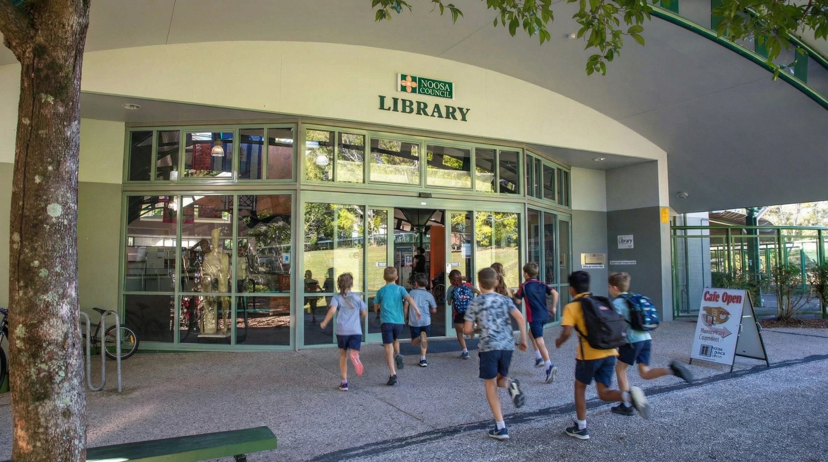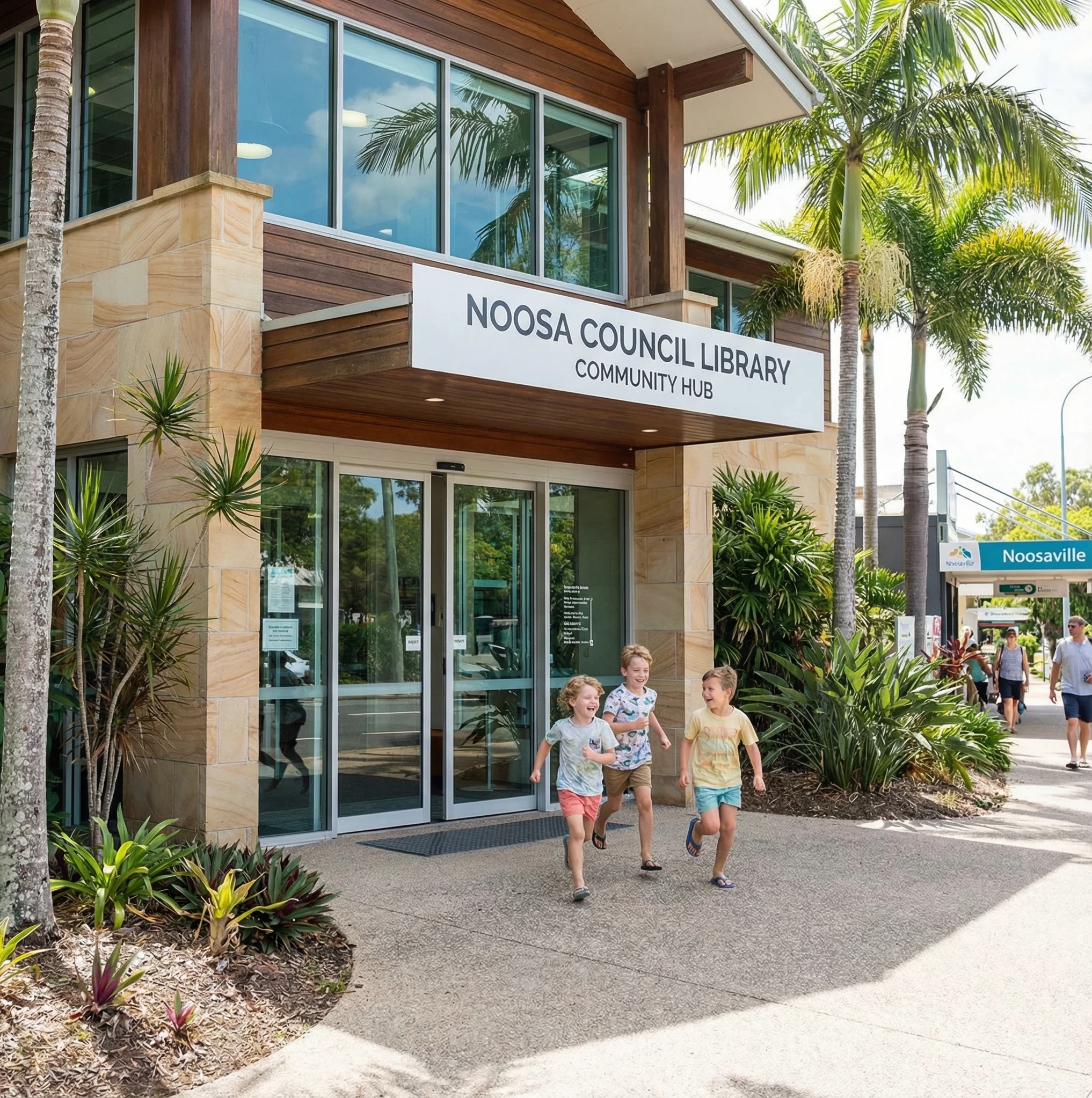 Well not bad but not really the front of the Library, however it is located in Noosaville as Image Studio added in the facia of a shop to the right. Ans the children are not running toward the Library. Perhaps if I had used "Noosa Council Libraries" instead it may have got the correct image. So I found and image of the front of the real library and added as a reference image. Also it did take a couple of goes to get Image Studio to have the children running towards the library.