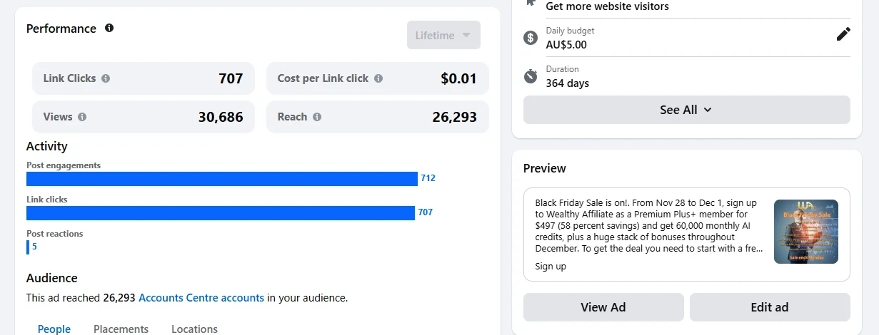 I placed the ad on Facebook about 20 hours ago. Checking Facebook progress here: