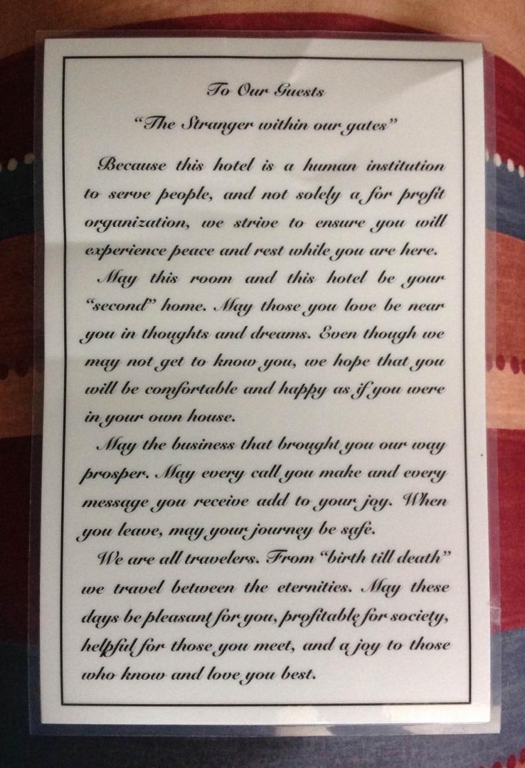 I want to thank you for sharing that letter because that letter is a inspiration to us all and I do not know of the hotel that I have ever been that I have seen a letter like that all the best