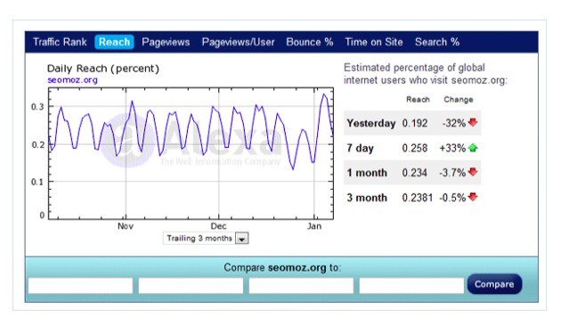 "Above is Alexa's estimate of SEOmoz's web traffic for the past few months. It's hard to tell how accurate they are, because they're not showing any exact numbers, only 'percent' of 'reach.' They do correctly note that traffic was down in December..."