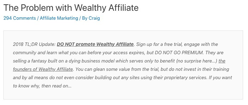 "2018 TL;DR Update: DO NOT promote Wealthy Affiliate. Sign up for a free trial, engage with the community and learn what you can before your access expires, but DO NOT GO PREMIUM. They are selling a fantasy built on a dying business model which serves only to benefit (no surprise here…) the founders of Wealthy Affiliate. You can glean some value from the trial, but do not invest in their training and by all means do not even consider building out any sites using their proprietary services. If you want to know why, then read on…"