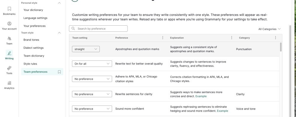 Click on the 'writing logo' tab on the left-hand side, scroll down until you see Team Preferences, and at the top of the team settings, there will be the 'apostrophe and quotation marks' box with 'explanation' and 'category'.