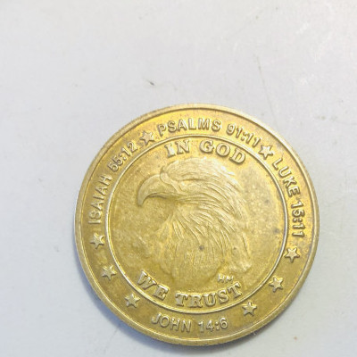 Back to me, why is god putting these coins in my hands and then they are not the right ones, so next day wife gives me a jar of penny's their are two big coins, one 1921 Australian penny good shape $1300.00 OK that's what I have, next a coin with Romans 10.13 and an eagle on the other side.hey it looks like it's gold, now it makes sense God had me looking because their was a gold coin in the house???I give it to the wife to polish up, holy molly it's gold.!!! I can't continue with this will put part two in a moment