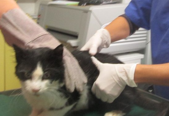 The cat is better. He eats by himself as long as the painkiller works. The vet says she has combed him and he looks great and he is a gentle creature. He needs antibiotics, every day an injection, for about 4 weeks.
