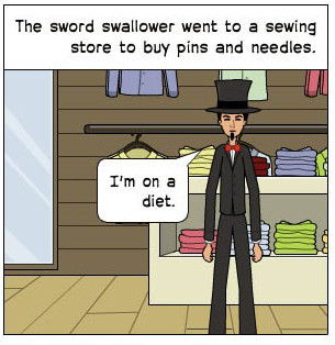 Got it! Thank you very much! After realizing the blooper, I substituted the sword swallower joke with another joke involving a speedometer. Humor is regional, I hope I got the joke right this time, LOL.
