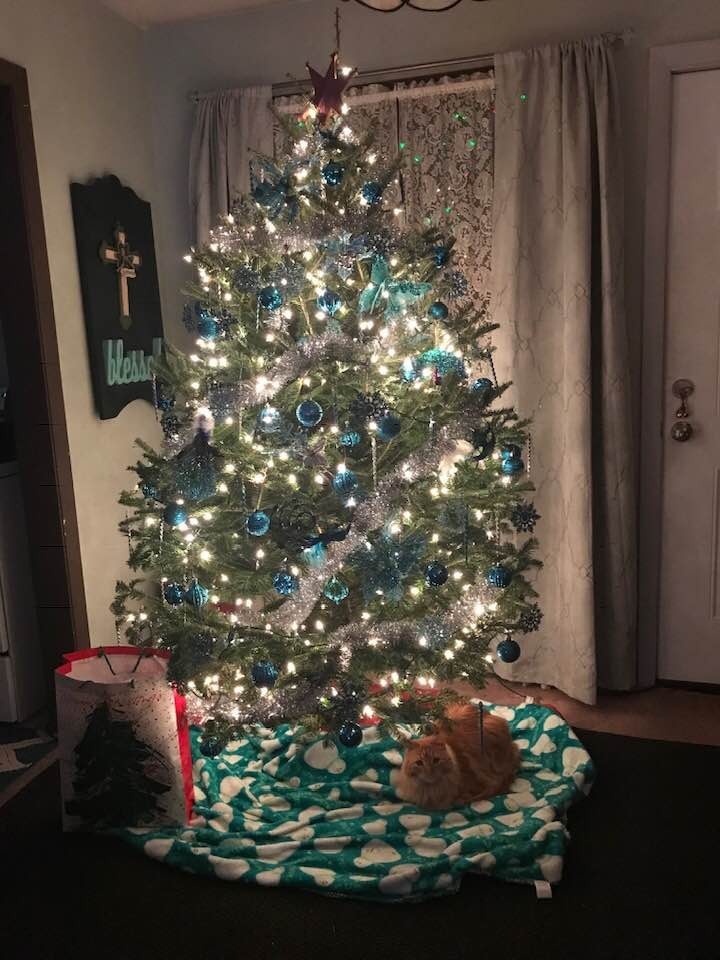 Toulouse is cozily nestled under our Christmas tree waiting very patiently for Santa Claws!