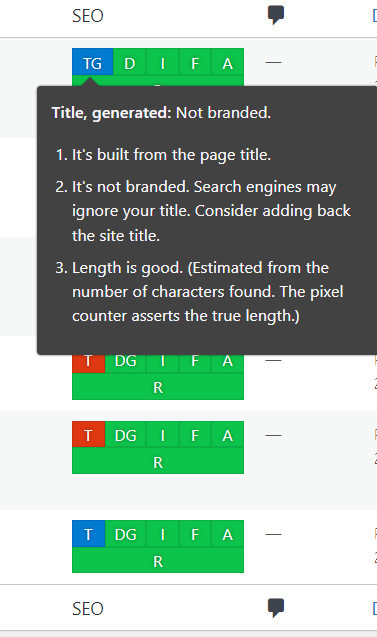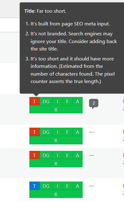 I need a bit of help with the back of my website, where it says "TG" under SEO - my TG's are always blue or red, never green. I have attached a few screenshots of what does it say when I click on the blue box or the red one, as I don't think I'm capable of explaining exactly what's going on ha