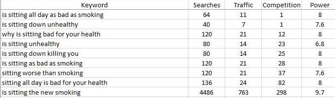 I am in the process of writing a post comparing the dangers of sitting against smoking. I have done some research and have found a few very usable keywords but would like to hear some ideas from you. I have listed the keywords in order of competition.