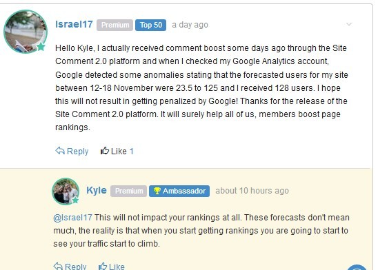Shortly after I started taking the comment boost, I received the message above in Google Analytics for a blog I recently created here at WA stating that some anomalies were detected by Google as the forecasted users for that site between 12-18 November were 23.5 - 125 but I received 128 instead which was more than the expected forecasts. Though I didn't panic about this, I intentionally asked Kyle so as to free other members who have been insinuating about suspicion or certain ranking implications.