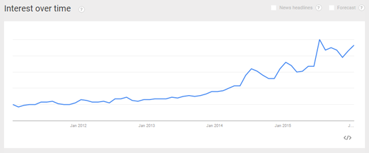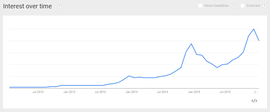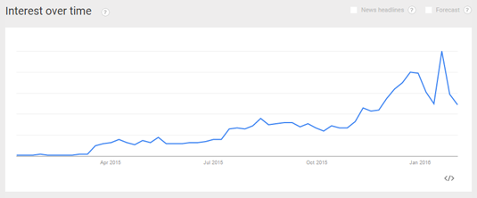 The trend graph for 3D printers looks to have leveled off a bit, but interest is still near an all-time high. Prices are slowly coming down on these and the ability to 3D print at home is going to turn a few heads.
