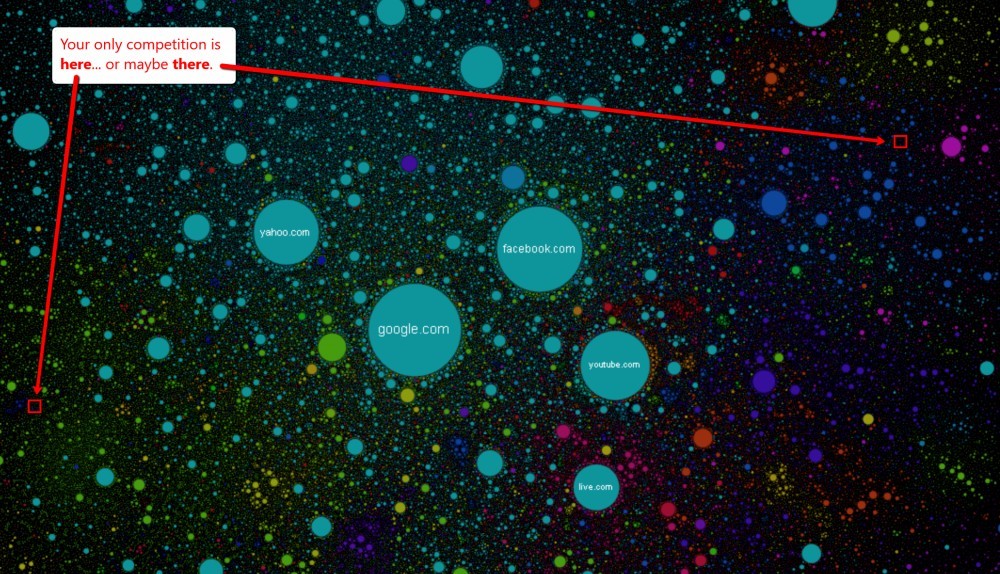 The image below is a visual representation of the internet. You're not looking to take over the world, just one small corner of the web where the competition is relatively low and there's enough people hanging out.