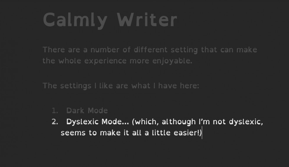 A great space for "just writing", as opposed to that busy space of comparing notes and researching. I love how it allows the previous sentences to fall into the background by making them fade. Can also put it in dark mode which makes me relax more when I'm looking at the screen.