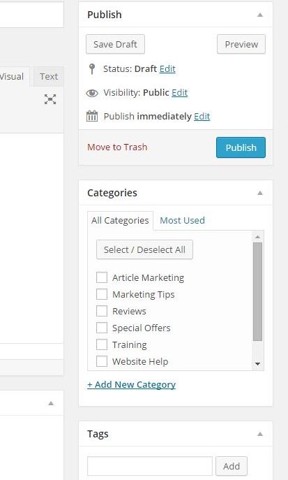 In the screenshot above you will see that some categories have already been added but when you create your first post this will only show as Uncategorised. You can get rid of this later. So add a category or two that relates to your blog post. Tick the box and your post will be listed under that category.