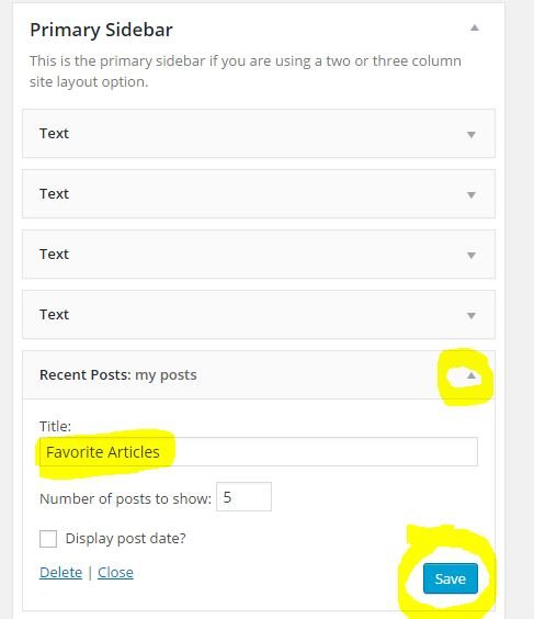 Step 5. You can change the title from Recent Posts to anything you prefer. Click on the downward arrow to open a drop-down option menu as show below. Here I have renamed it 'Favorite Articles'. Then click save.