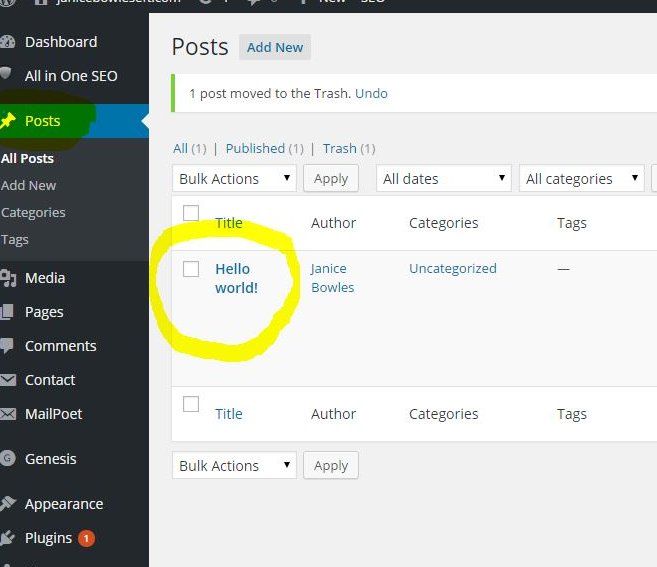 Step 7. Go to 'Posts' in your dashboard menu. You will see the default post 'Hello World'. Hold your mouse over it and you'll see the option to delete it. However if this was a post you had created, it would automatically show in the sidebar area.
