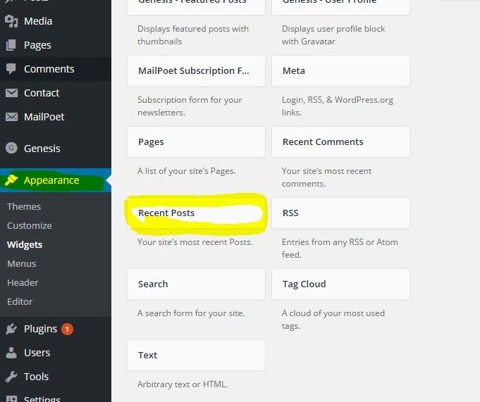 Step 1. Go to 'Appearance' in the dashboard and then 'Widgets'. Here you will see a list of the optional widgets that you can add to the sidebar. There is one named 'Recent Posts'.
