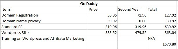 If I compare the prices on Wealthy Affiliates with the cost of WA. There is a break even point of 4. The following shows the prices for four sites from Go Daddy in comparison with the same number of sites from Wealthy Affiliates. With WA premium membership (Included in the prices below) you can have up to twenty-five domains.