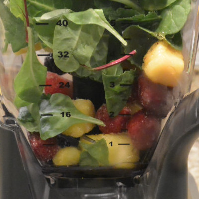 I use a 1/4 cup of each of the fruit and a 1/8 cup kale spinach. Blend until smooth.