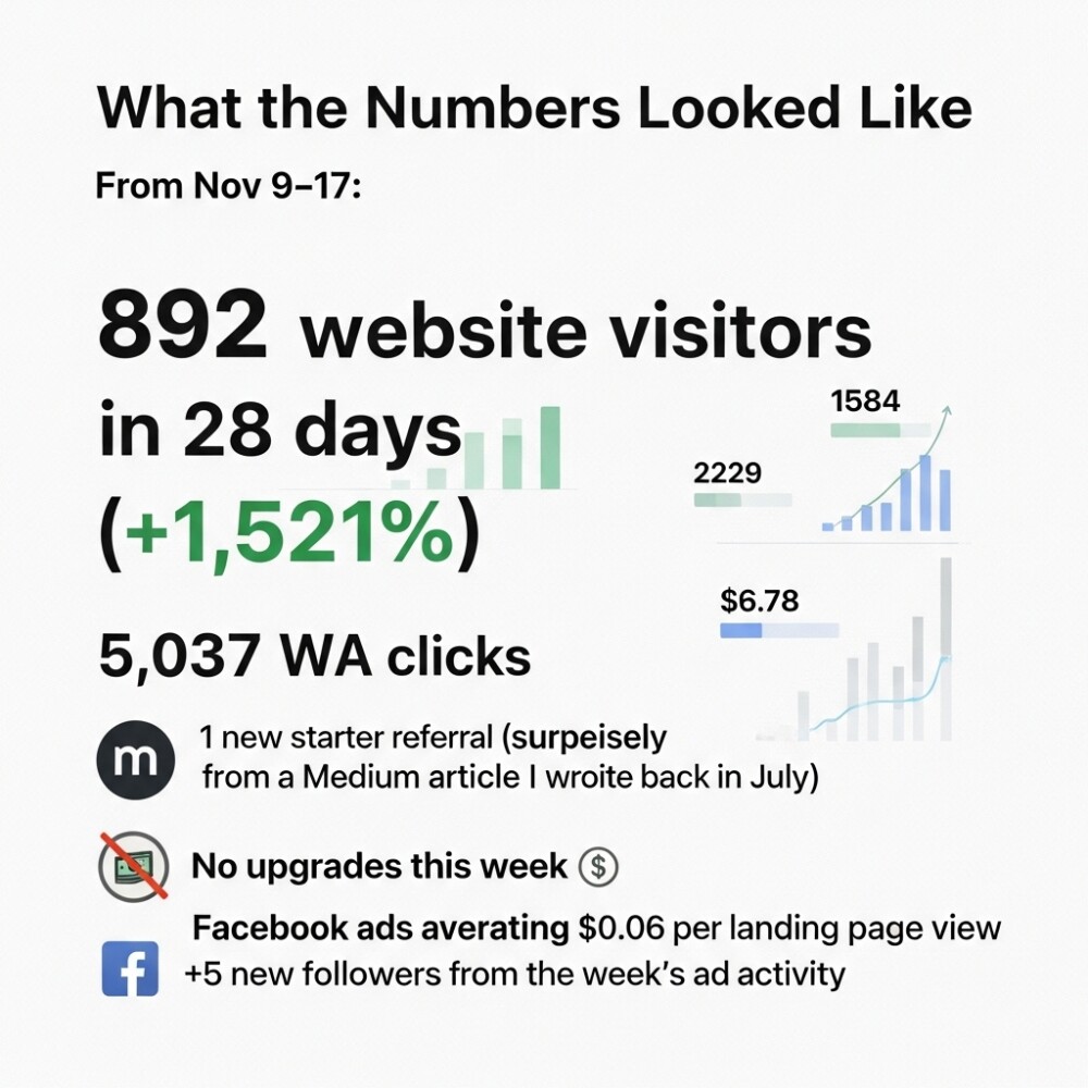 Website traffic is up, but WA click-throughs dipped a bit — mostly because I’m testing the “Facebook → my site → WA” flow now. There’s definitely room to improve the conversion path on the site itself.