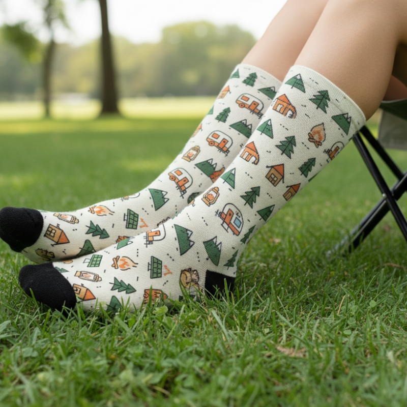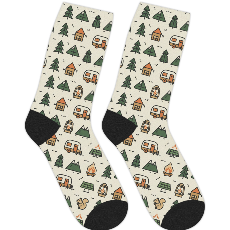 I want a full wrap pattern that reflects RV life, camping and off-grid aesthetics. Must work on both socks and align evenly when repeated.