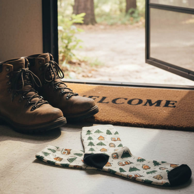 Use Image A as the printed sock design and place the sock as a realistic product in an RV entryway scene beside a pair of hiking boots and a welcome mat. Soft natural light, real texture, real shadows, no reflections, no gloss, no floating edges.