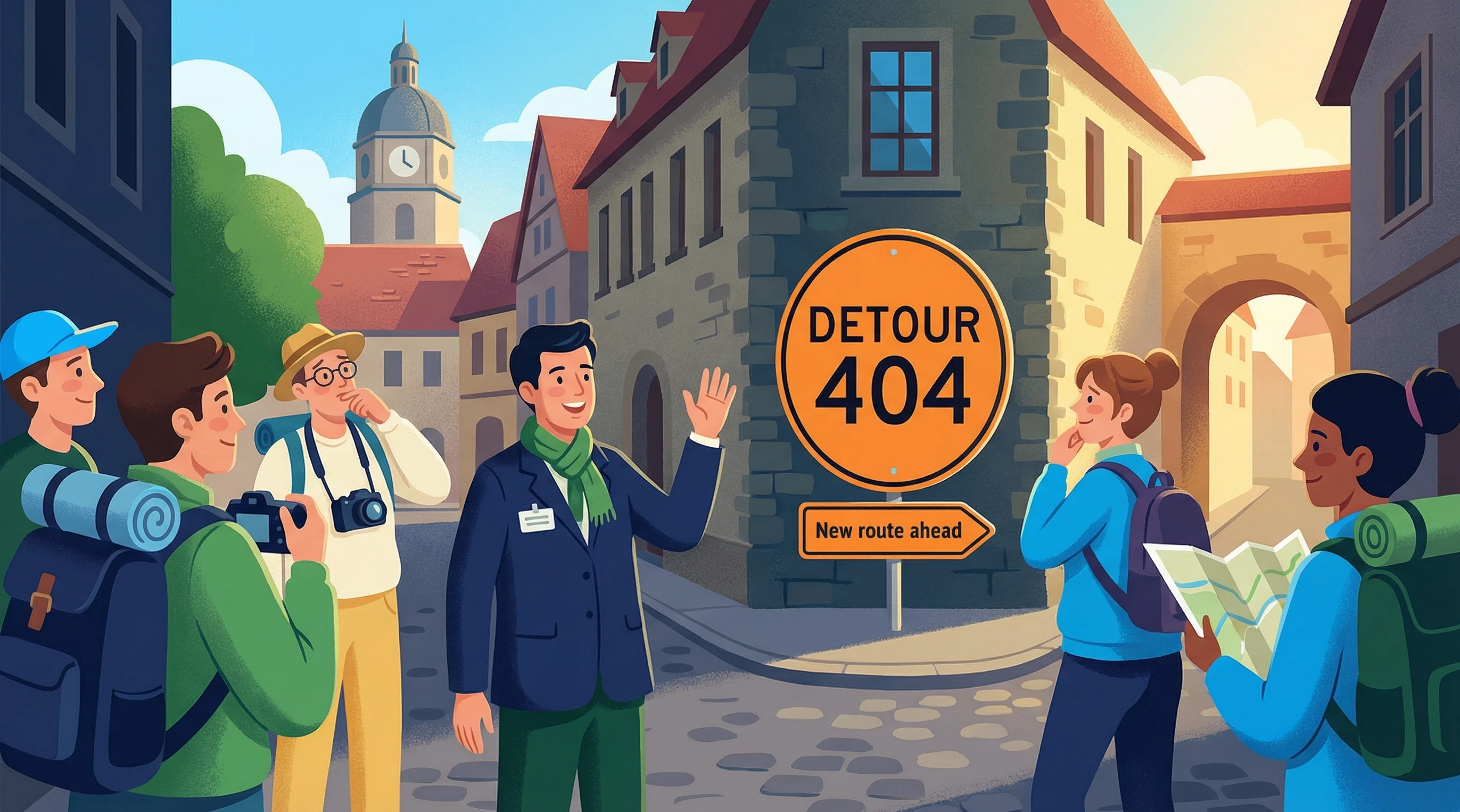 A group of travellers with backpacks walking into a narrow European street, only to find a big orange DETOUR 404 sign blocking the way.