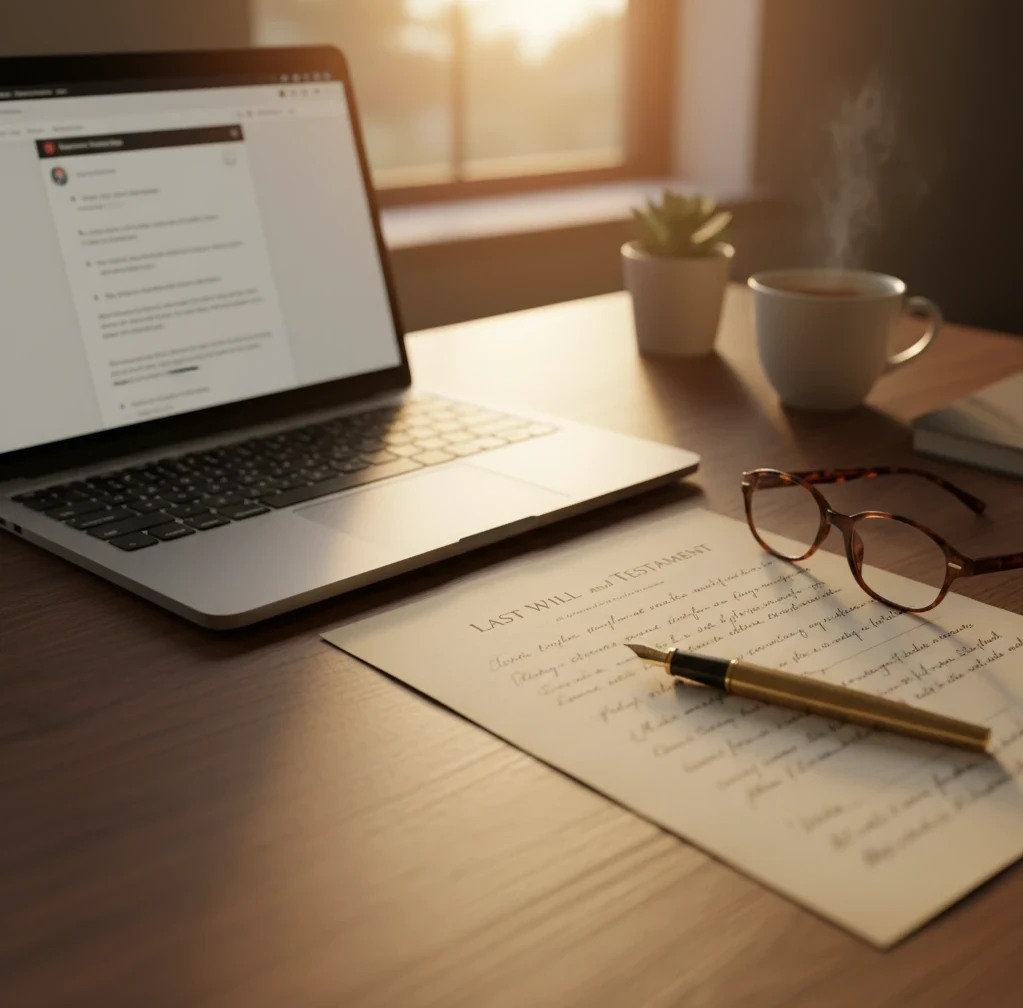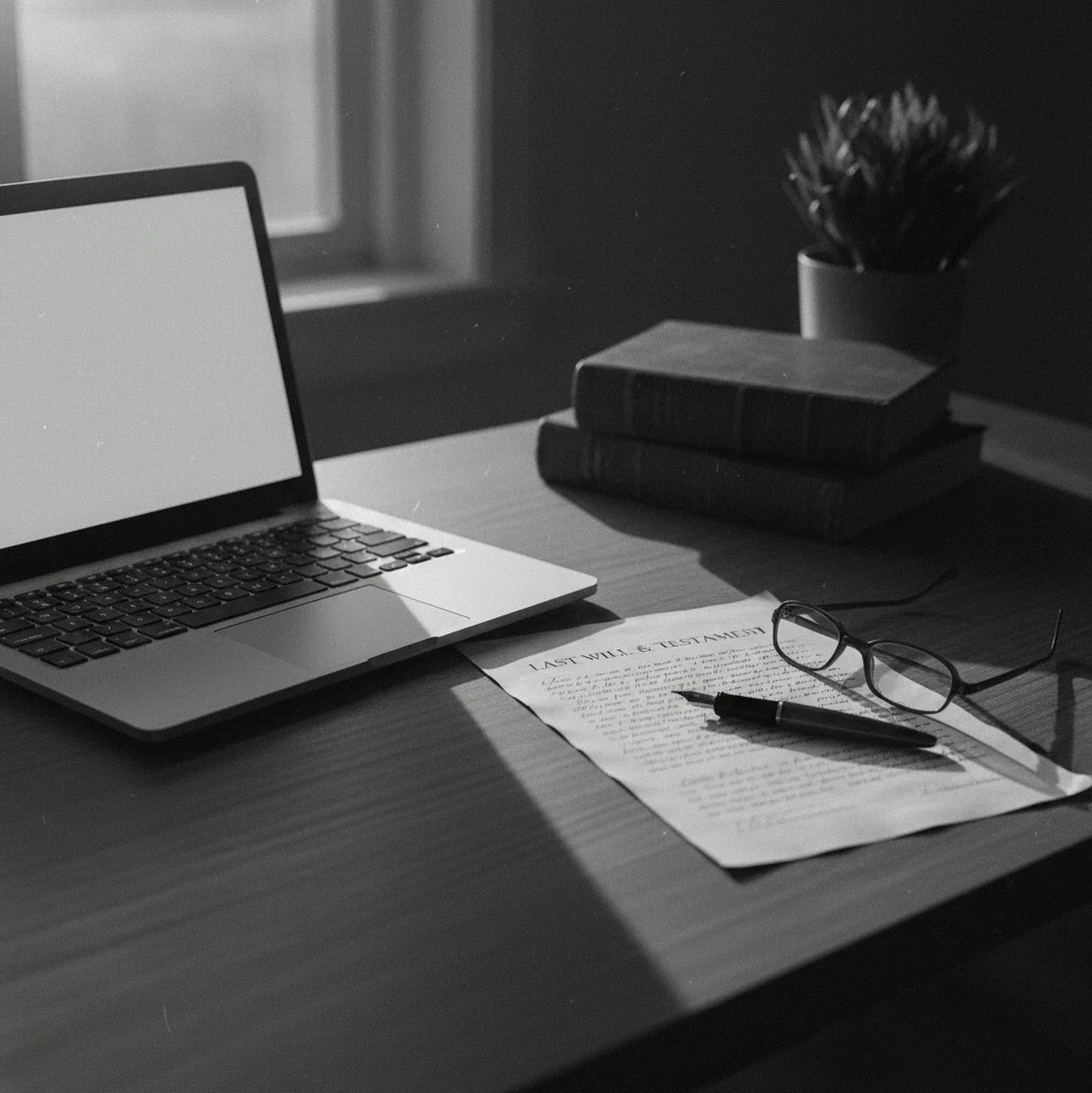 “A black and white desk scene with a laptop, will document, books, pen, and glasses, symbolizing the seriousness of long-term digital legacy planning.” "You didn’t prepare properly."
