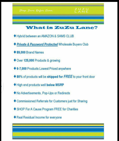 Zuzu Lane is a members only shopping site (you gotta know someone to get in!).. we offer all of the same stuff that you'd find at your favorite retailer, but for less; because of that members only thing, the manufacturers don't have to pay for advertising or retail shelf space, so they can offer OUR customers the product for a lot less!
