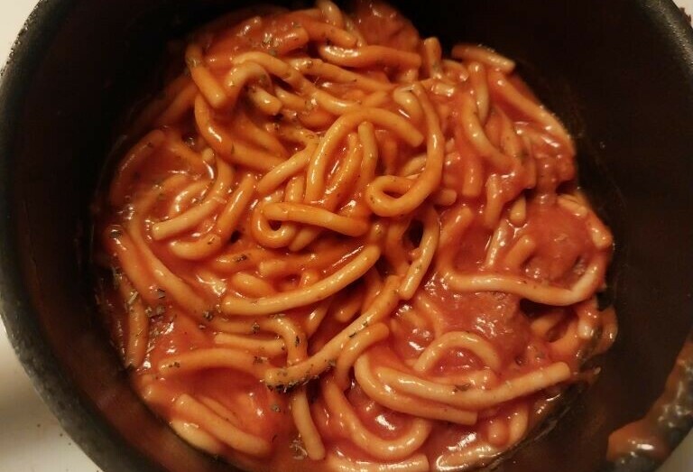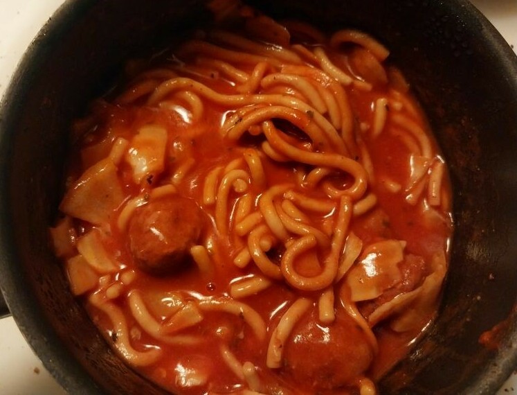 Right after that, I opened a can of spaghetti and meatballs, added some spices to it, and even though not shown in the image, I also chopped up a few onions too!