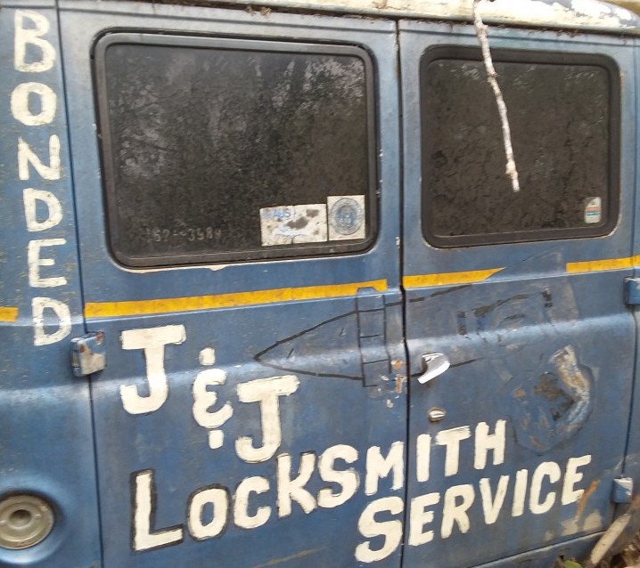 As in all my business ventures, my first goal was to be looking the part--for my fledgling Locksmith Business, I bought a 1963 Ford Econoline Van and hand painted it with my own artwork, made most of my own car lockout tools, and invested in some locksmithing tools. This is a shot of my first van as it sat in 2019 in my Salvage yard that I had to sell after it flooded. Sadly, I had to sell it, but not before I sold all the doors and other critical parts.