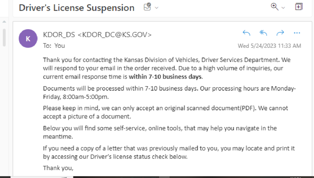 I sent an email to a department in the State that promised to address the issue with my driver's license. (You really will not get to talk to anybody in person--what to I even pay taxes for?)