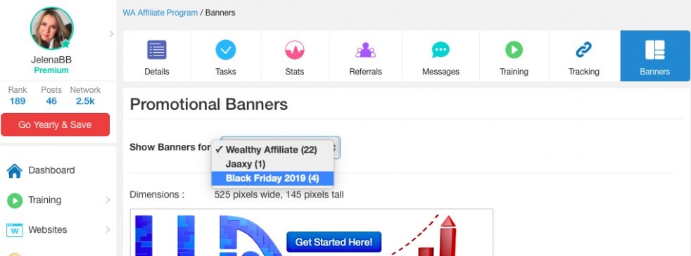 There are three options: Wealthy Affiliate, Jaxxy, and the third, the new option is Black Friday. Clicking on Black Friday will give you four brand unique banners, ready for this year's promotion.