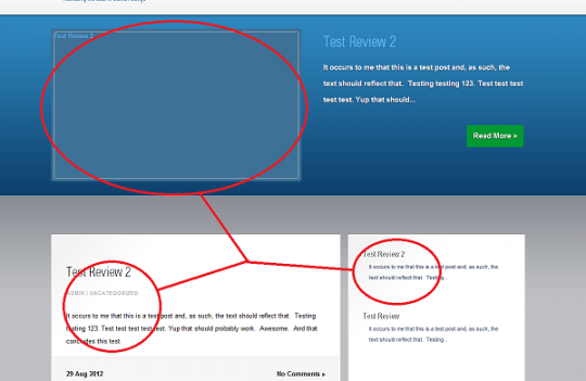 I set up a couple test posts (or "test reviews" in my case) for my blog page to observe the aesthetic layout on my site. Unfortunately I can't figure out how to have thumbnail/preview images show up for the postings on the blog. I realize that in some of the more minimalist themes, this may or may not be an option, but the theme I'm working with is very much geared towards such visuals (even having a large featured preview area).