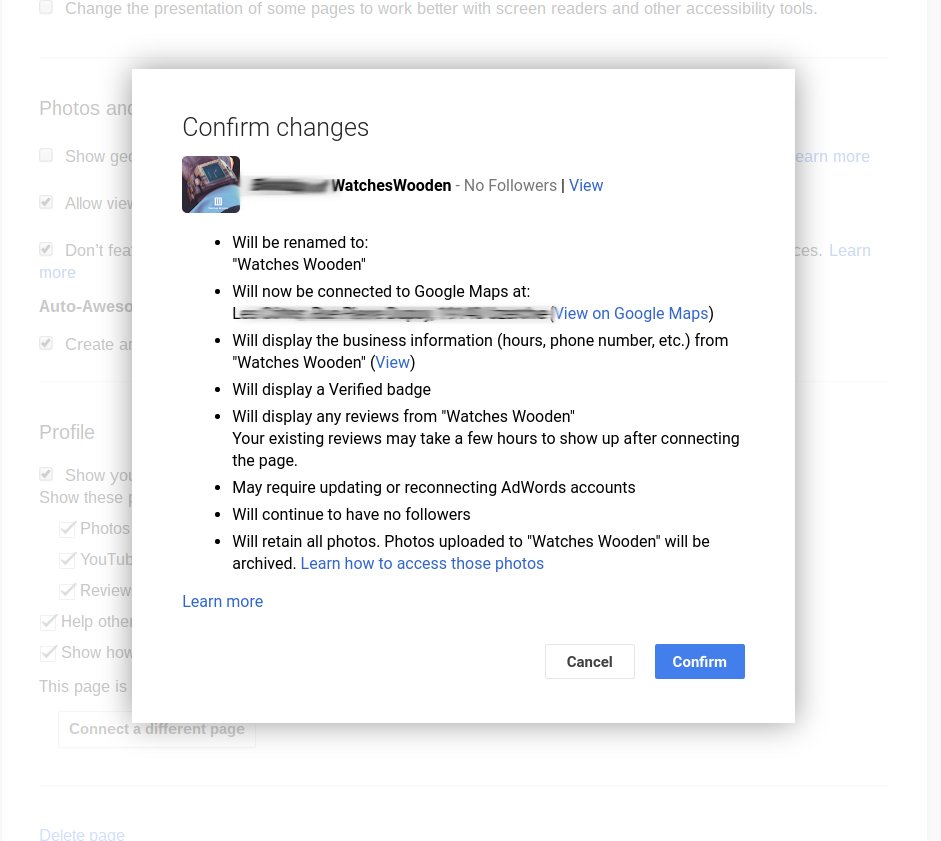 - No longer display photos from the former local page. To add the photos, visit the former local page, download your photos, then upload them to the newly-connected local Google+ page.