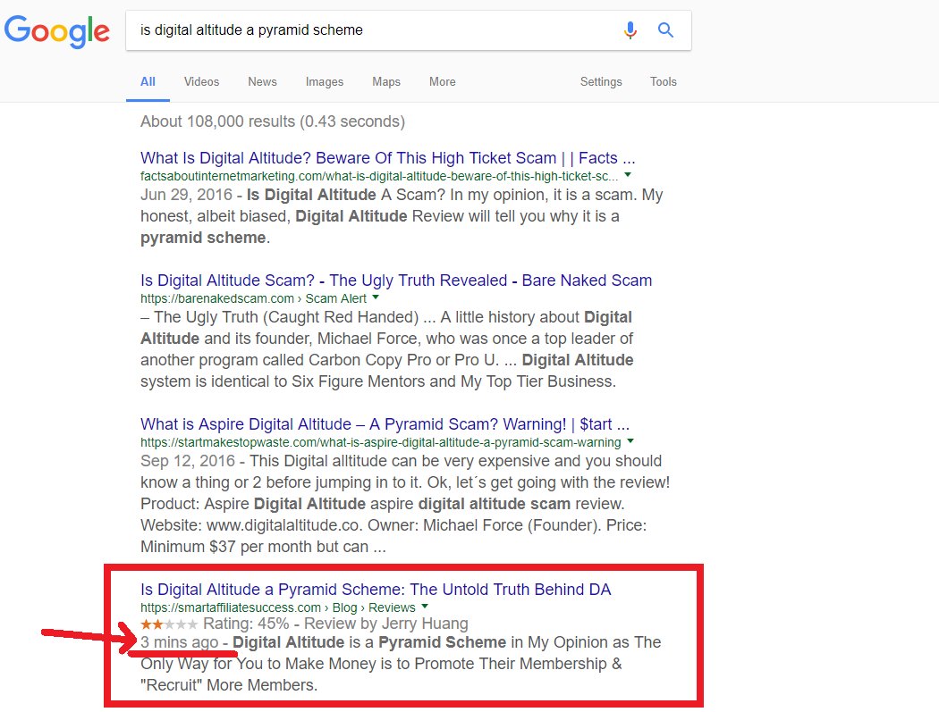 As you can see, this is a review I wrote on Digital Altitude, and the SERP shows "3 mins ago". It's a really motivating result.